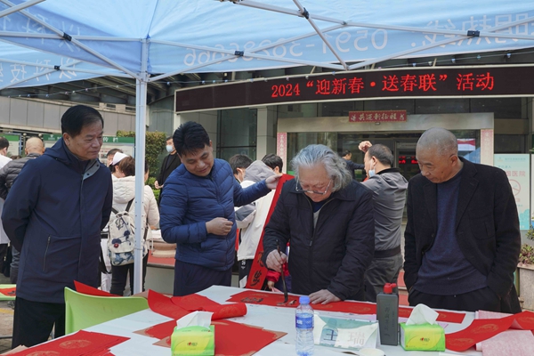 来领取春联的群众络绎不绝,或簇拥桌前观摩专家书写,或认真挑选自己心仪的春联内容,拿到春联后压纸晾字、互相品评,分享喜悦。