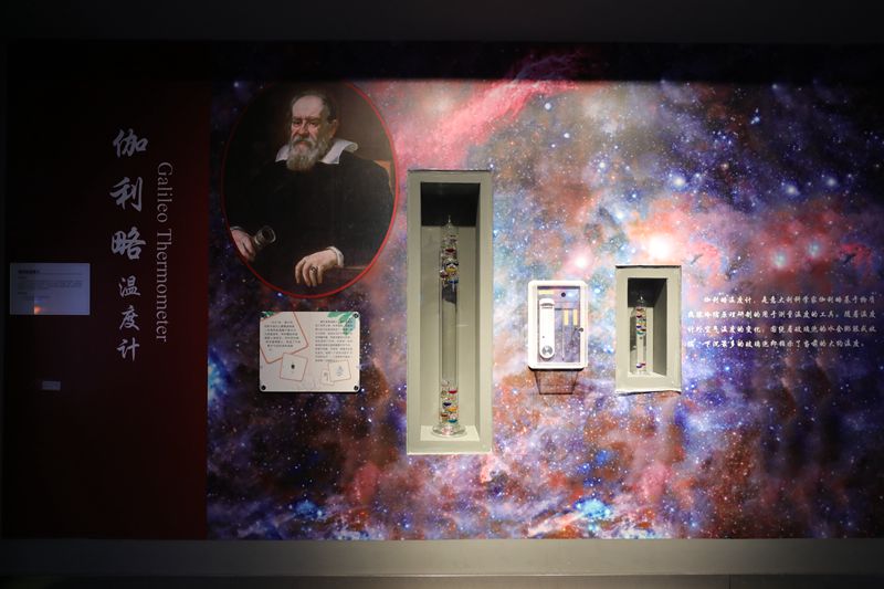 我们可以看到伽利略温度计,是由密闭玻璃圆筒、透明液体和不同密度的玻璃球组成的,其中的透明液体是对温度敏感的有机液体。我们知道物体密度取决于质量和体积,当温度变化时,有机液体的质量不变,但体积会因为热胀冷缩而受到影响,导致有机液体密度改变。根据阿基米德的浮力原理,如果物体密度等于液体密度,物体可以停留在液体内任何位置。所以玻璃圆筒内悬浮的玻璃球密度等同于此时有机液体的密度,我们可以根据金属圆盘上的数字得知当下温度。然而有时候玻璃球并不一定会悬浮,那么这个时候我们该如何读取温度呢?当出现上浮情况时,此时温度应是低于浮在顶部最底端玻璃球所示;当出现全都下沉时,此时温度应高于下沉顶部的玻璃球所示。简而言之,伽利略温度计正是通过外界温度变化影响液体的密度,改变玻璃球的沉浮状态来测量温度。