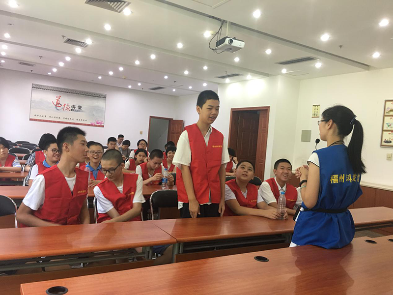 即使外面是八月似火的骄阳,小小志愿者们也依旧满怀热情。活动中,我们福州科技馆的工作人员首先集中对志愿者们进行简单的岗位培训,带大家了解了科技馆志愿者的角色定位、岗位职责,以及在劝导游客不文明行为时的礼貌用语。还用情景模拟的形式让小小志愿者们更加清楚地知道在志愿活动中将面对的情况,做好应对准备。