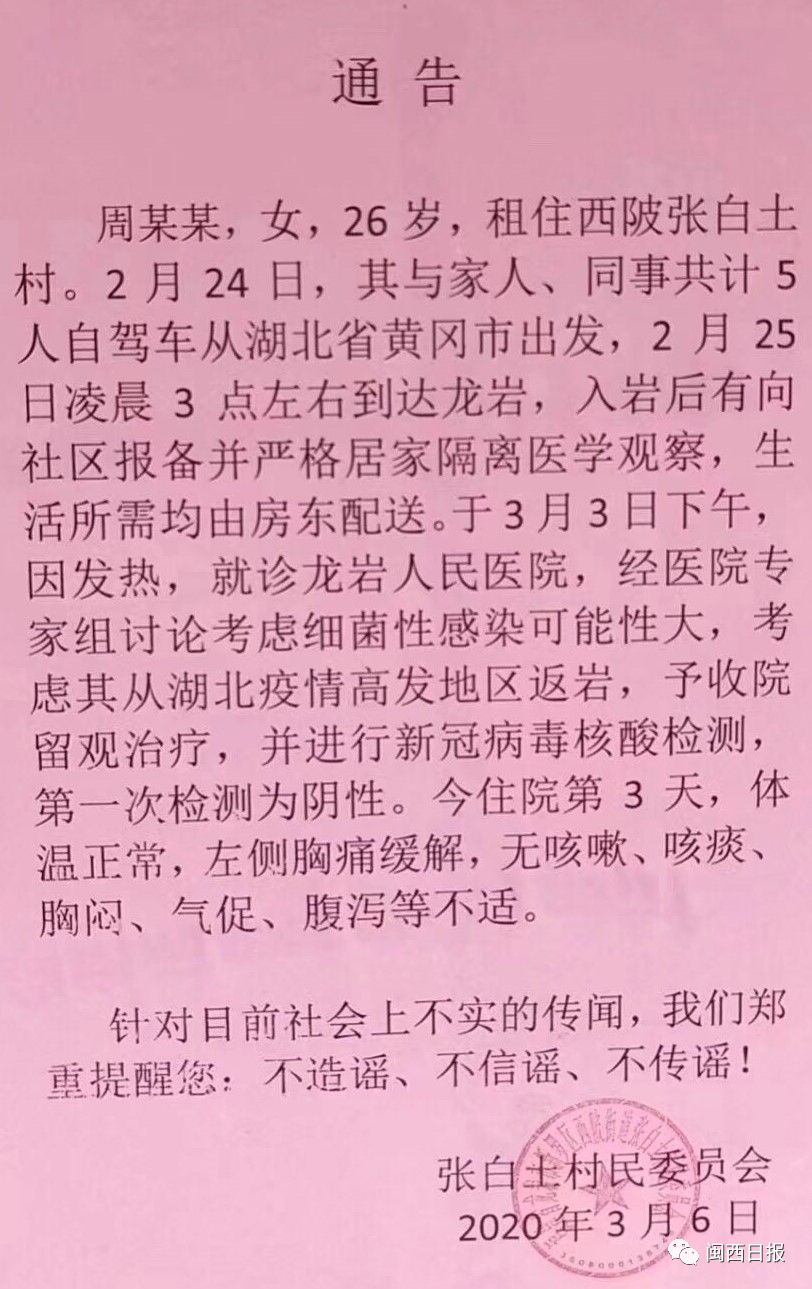 “龙岩城区张白土有湖北来的新冠患者”为不实信息!3月6日0时—24时,