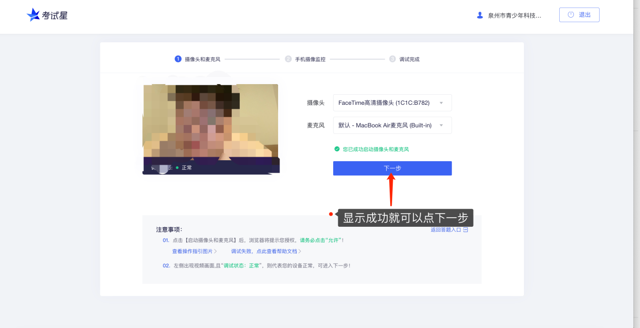 选择考试调试设备(调试摄像头、麦克风设备),确保作答设备稳定、正常。