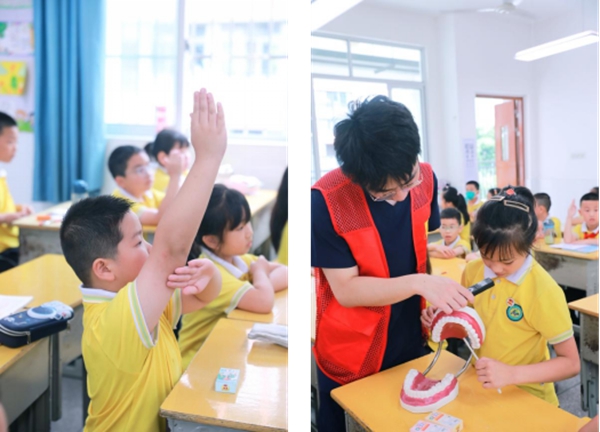 如何正确刷牙?若蛀牙了,该怎么办?活动现场, 美蒂斯口腔志愿者为学生们带来了一节简单有趣的口腔科普课堂。