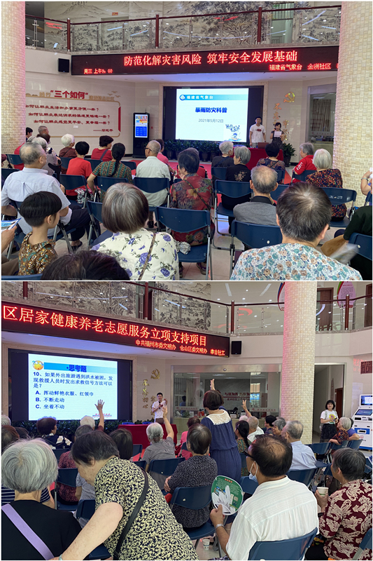 金洲社区讲堂内,省台气象专家高聪晖作了题为“暴雨防灾科普”的讲座,用浅显的语言让社区居民了解暴雨并科普防御暴雨知识。讲座后的答题环节更是场面热烈,大家学以致用,积极回答专家提出的问题。